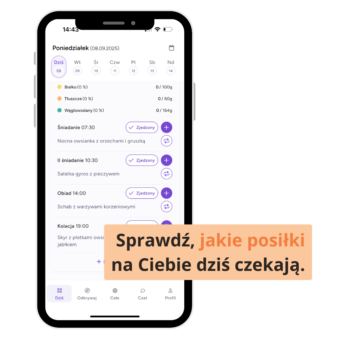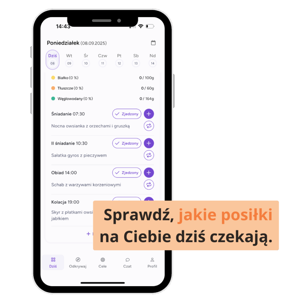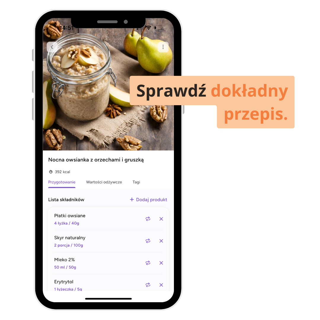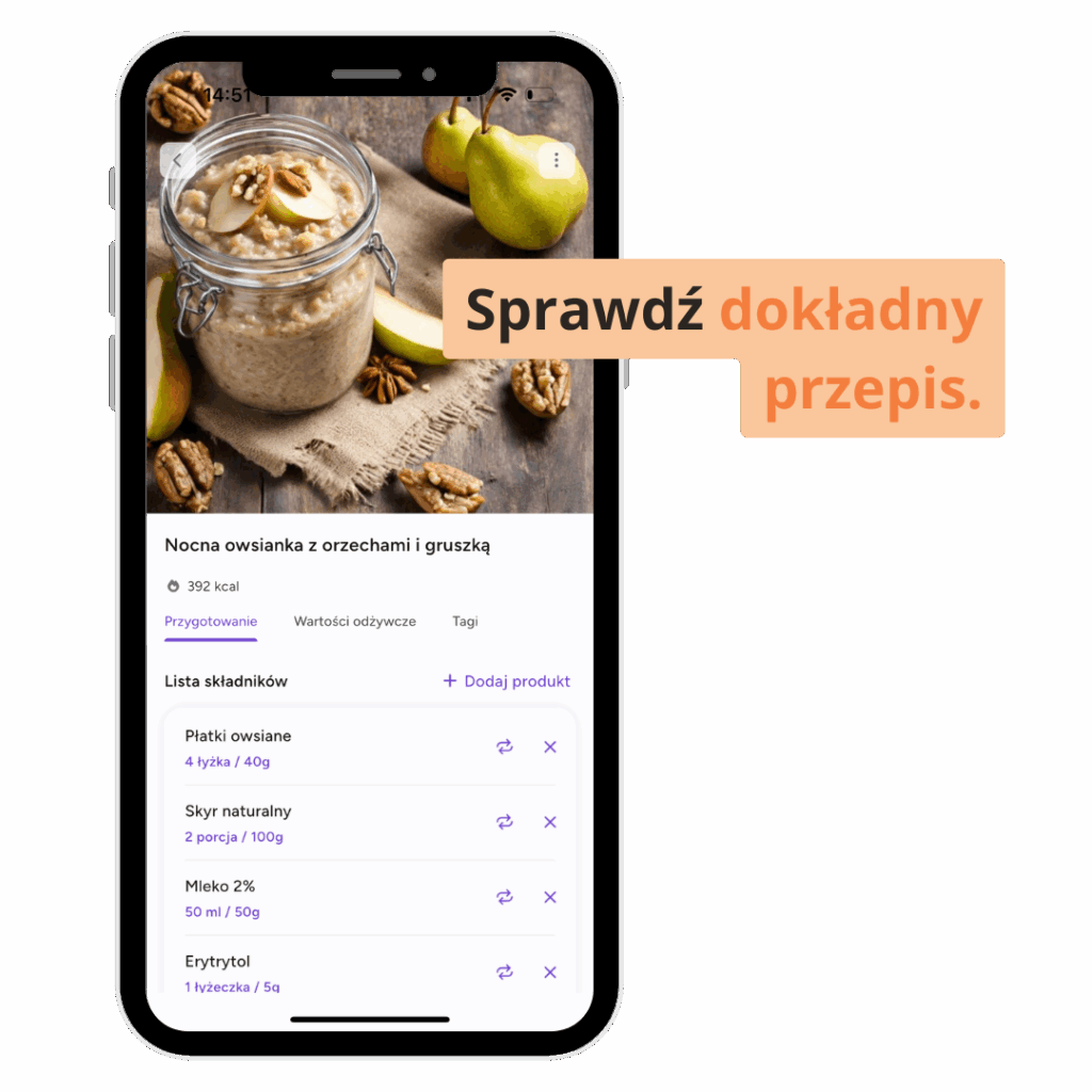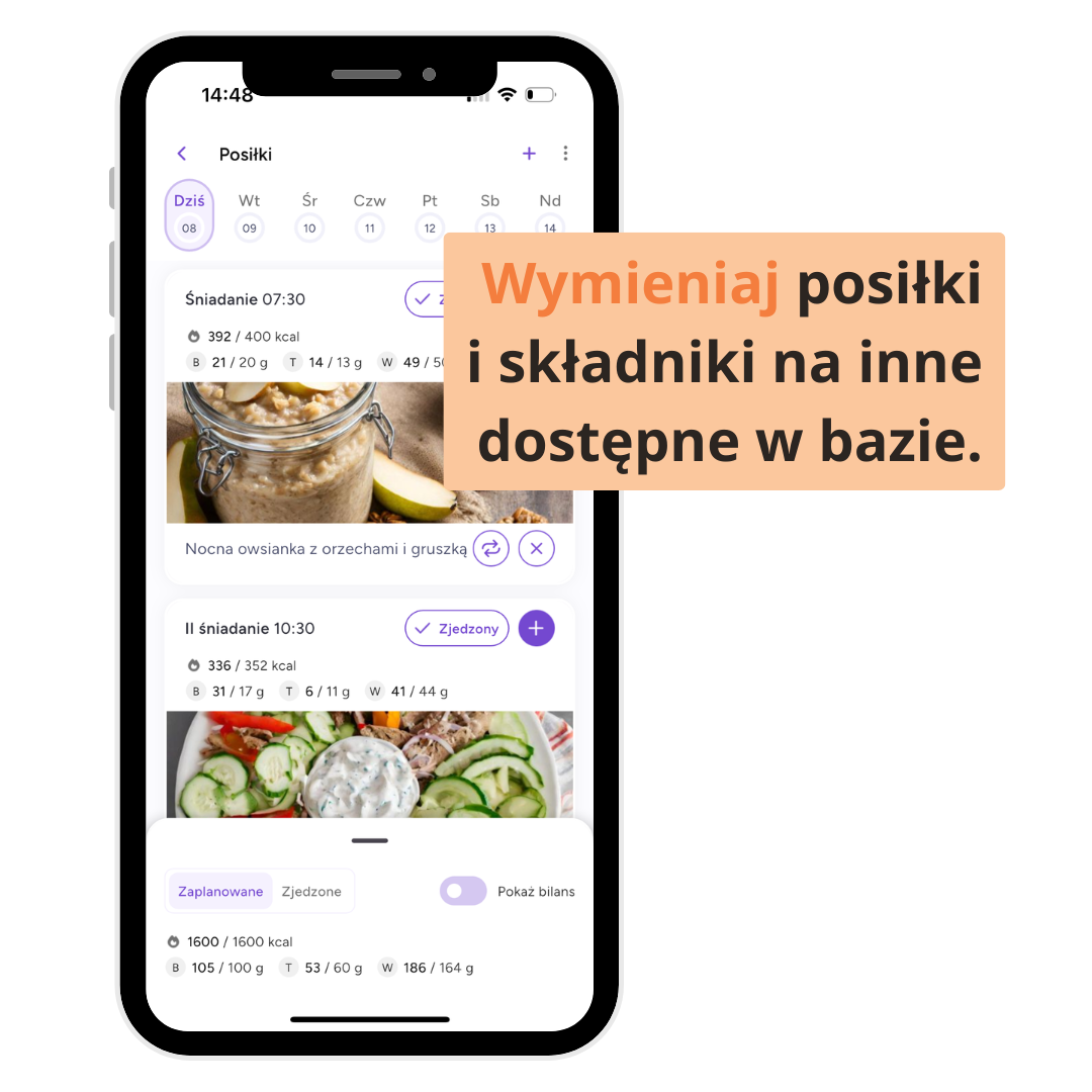 Możesz swobodnie wymieniać posiłki, dodawać własne przepisy i produkty – bez zaburzania kaloryczności. To Ty decydujesz, co ląduje na talerzu.