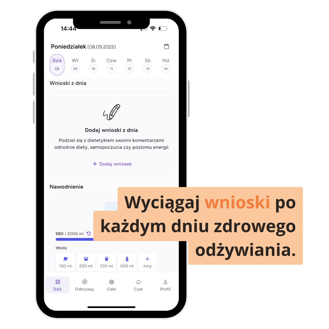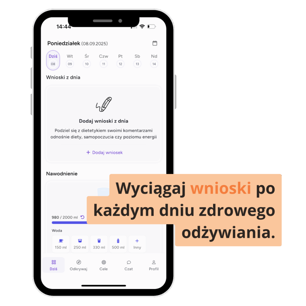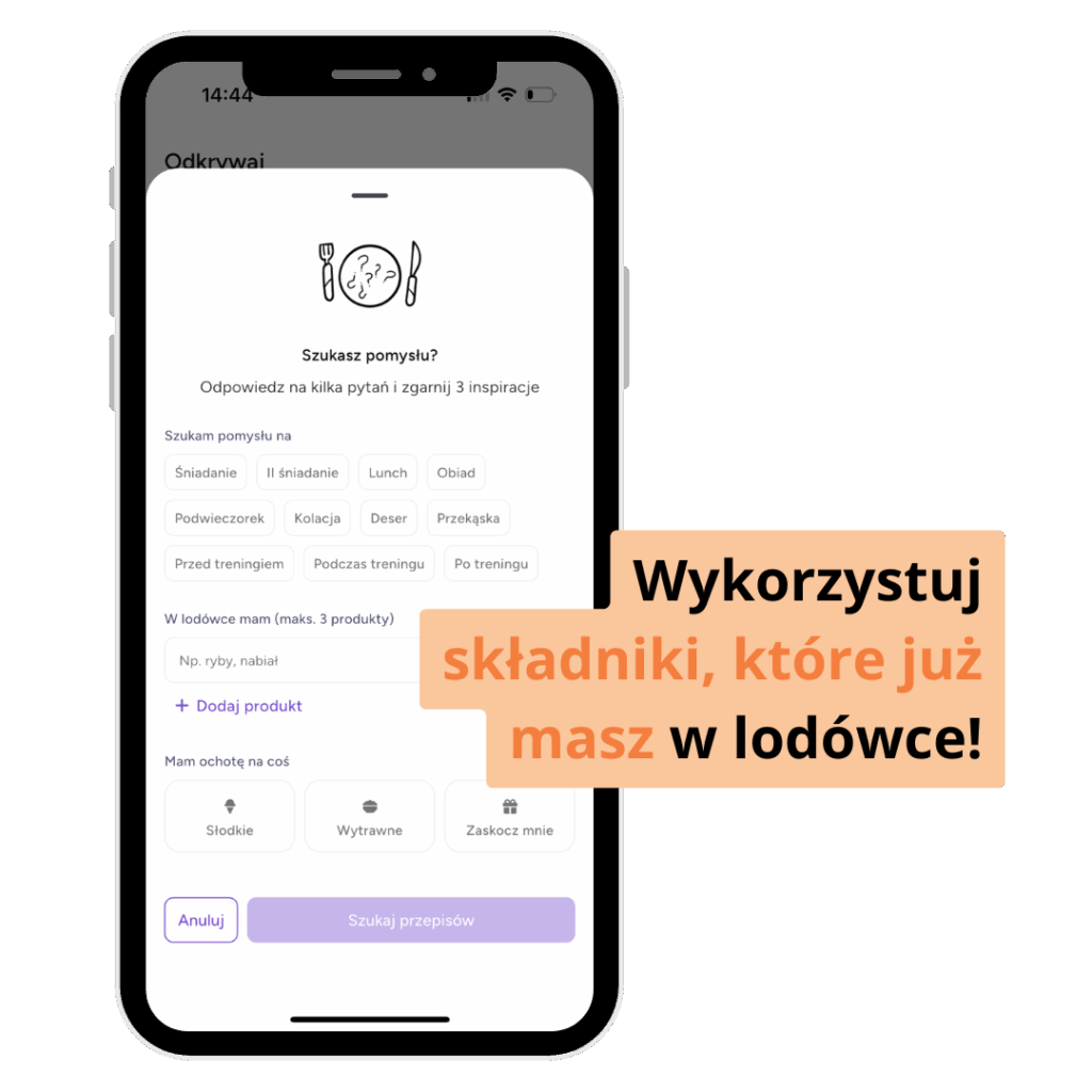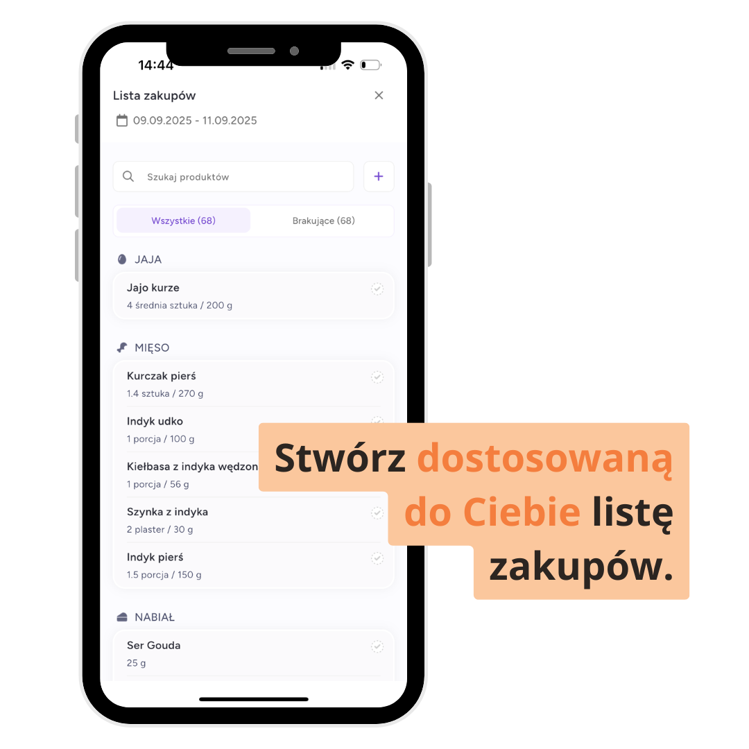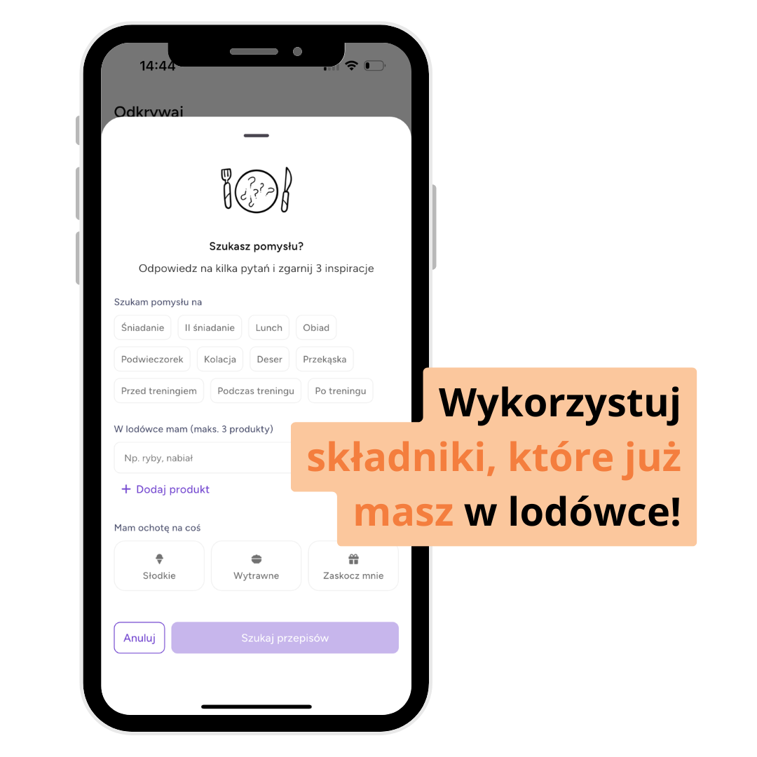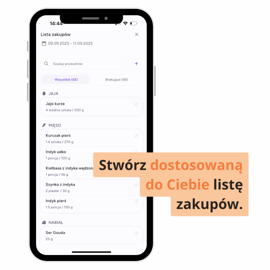 Możesz swobodnie wymieniać posiłki, dodawać własne przepisy i produkty – bez zaburzania kaloryczności. To Ty decydujesz, co ląduje na talerzu.