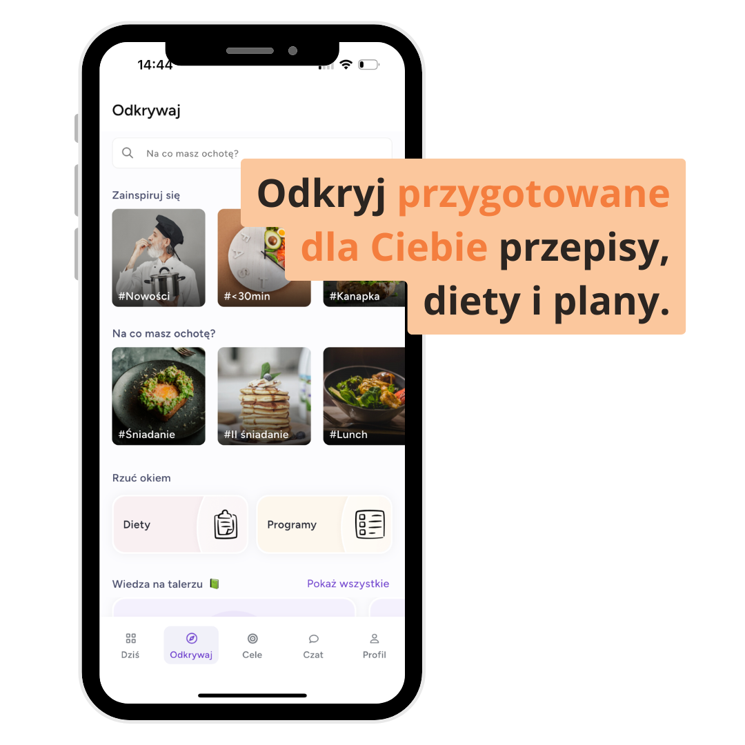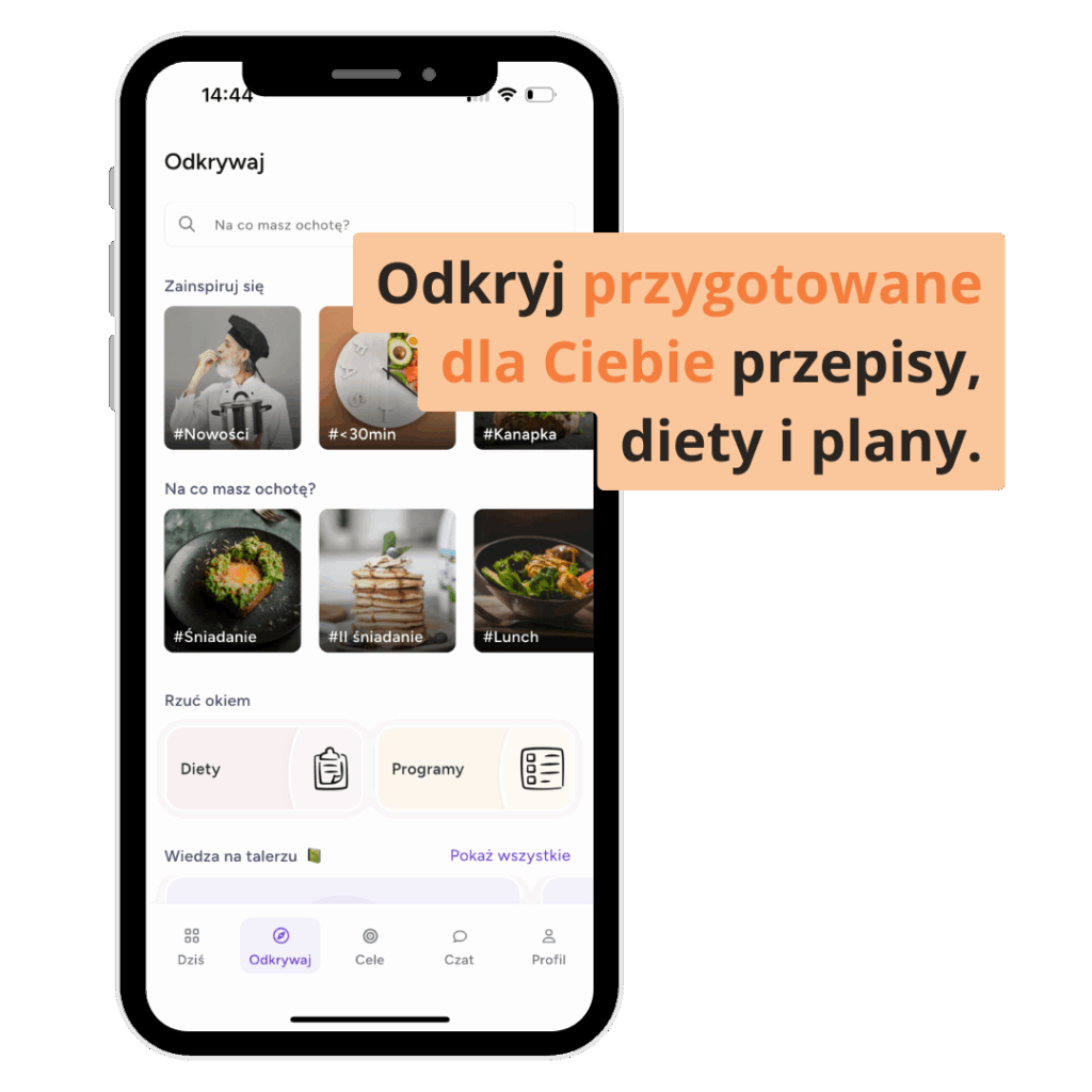 W pakiecie STANDARD i PREMIUM masz dostęp do personalizowanej diety. To plan posiłków przygotowany w oparciu o Twoje potrzeby i styl życia. Wybierasz kaloryczność, liczbę posiłków oraz typ diety (standardowa, wegetariańska, niski IG).