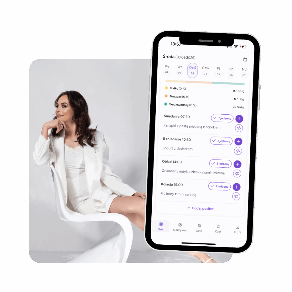 To nie kwestia silnej woli — to kwestia hormonów. Gdy glikemia jest niestabilna, a hormony rozregulowane, żadna “zwykła” dieta nie zadziała. Dlatego, jako dietetyk kliniczny i niedługo też lekarz, stworzyłam aplikację z gotowym planem żywienia, który uwzględnia to, jak naprawdę działa kobiecy organizm. Zero liczenia kalorii. Zero zgadywania “czy mogę to zjeść?”. Sprawdź plan dopasowany do Twojego organizmu.